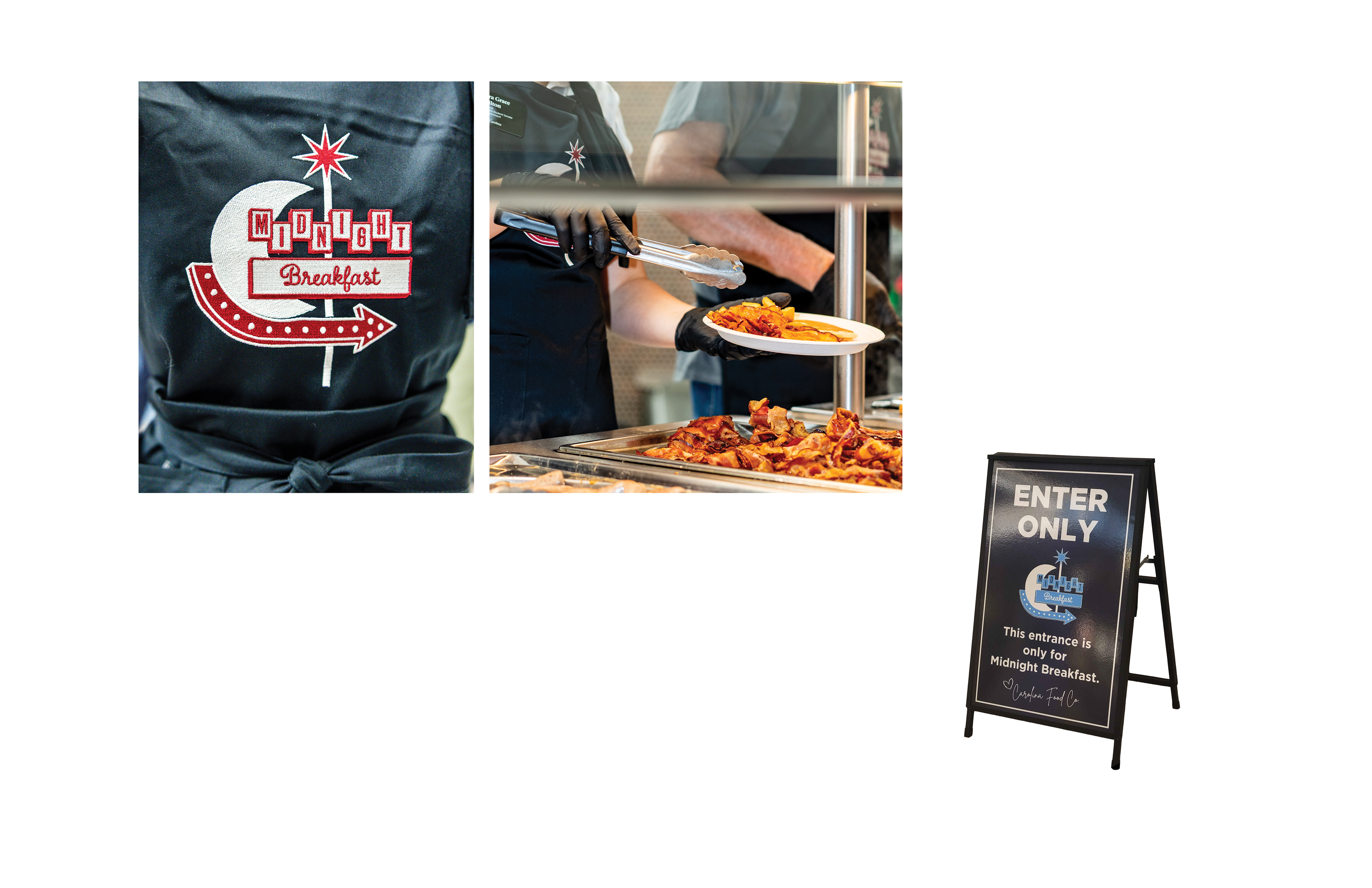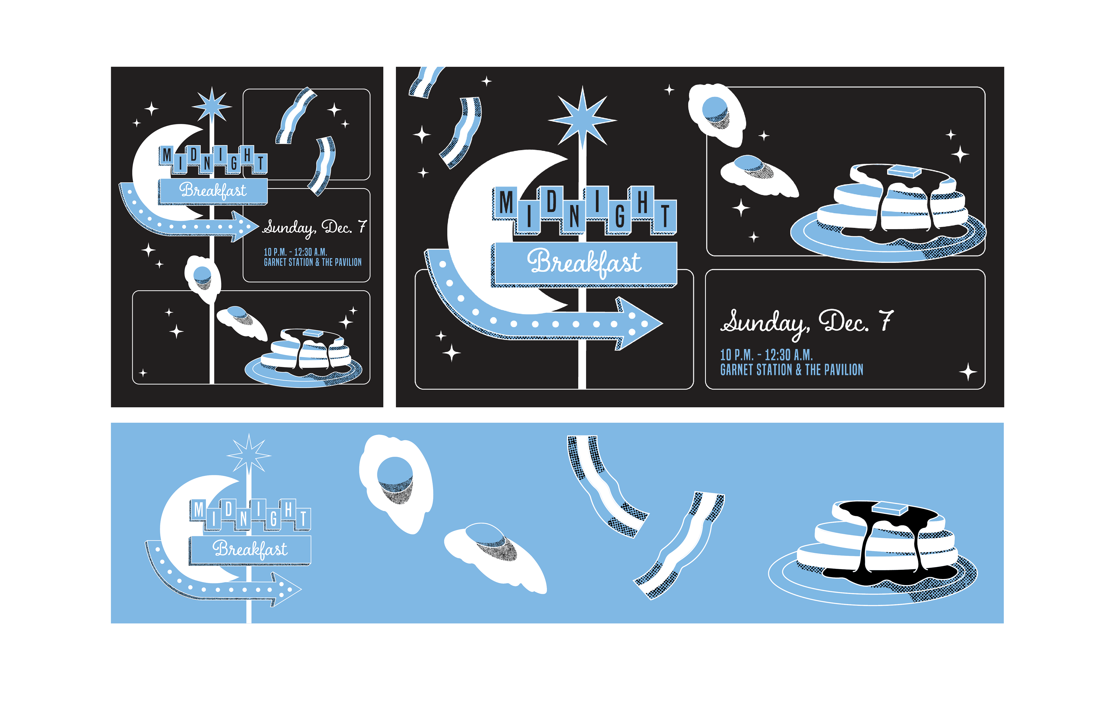 I began this project by referring to the retro diner theme of previous graphics. The client wanted to retain the same aesthetic but a refreshed design, centered around a logo that would be fitting for a classic American diner. It started with a sketch of a crescent moon, then bacon, eggs, and pancakes. The event was a great success, with hundreds of students in attendance, drawn in by nostalgia and the promise of good food.